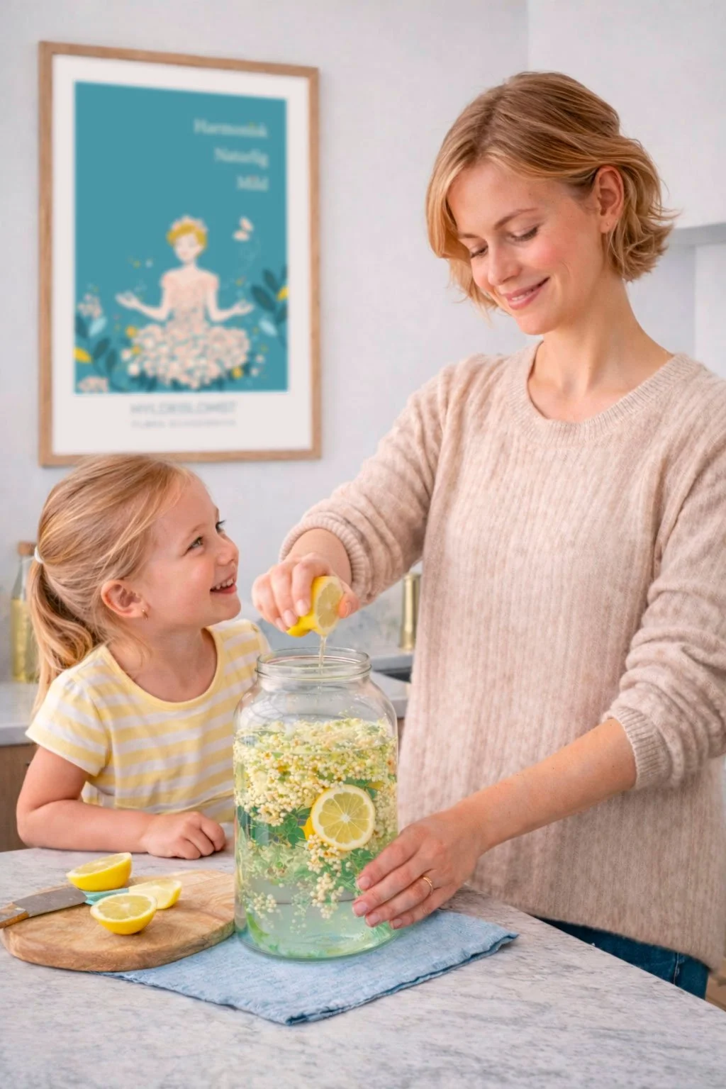 Et glas hyldeblomstsaft, der langsomt bliver til.